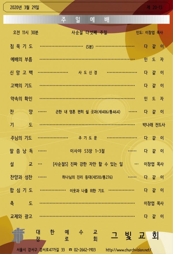 2020년 3월 29일 사순절 다섯째 주일예배 안내입니다.