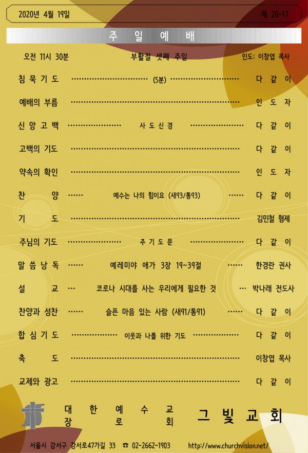 2020년 4월 26일 부활절 셋째 주일 예배 안내입니다.