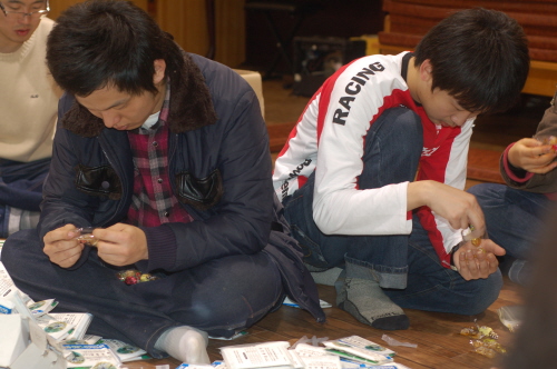 휴지안에 사탕을 넣으면서 전도용품을 만드는 중...