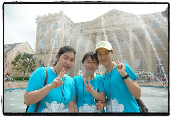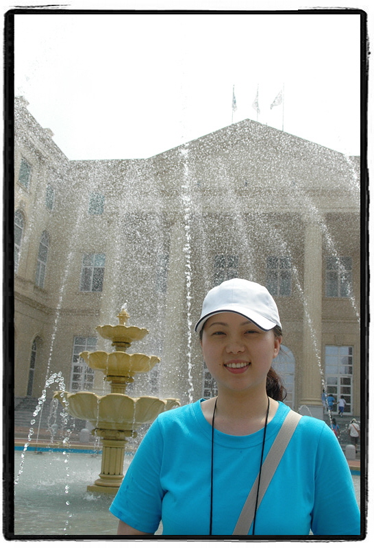 분수를 배경으로...